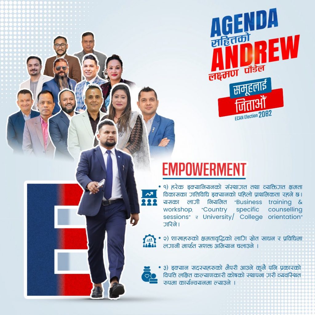 विगतको अनुभवबाट थप तिखारिँदै आफ्‌ना गहकिला योजना, एजेण्डा र भावी कार्ययोजना सहित सबै चुनावी प्रतिष्पर्धामा होमिएका हुन् । वर्तमान नेतृत्वमा रहेका शेषराज भट्टराई एक कार्यकालमै फलदायी र परिणाममुखी काम देखाएर स्वैच्छिक वहिर्गमन हुँदैछन् । उनले विद्यार्थी, अभिभावक, छाता संगठनभित्रका सदस्यहरु, अग्रजहरु, शिक्षा मन्त्रालय, दूतावास, कूटनीतिज्ञ, विदेशी विश्वविद्यालय लगायत अन्य सरोकारवालाहरुसँग इक्यान र यसको गरिमालाई थप चिनारी दिएर नयाँ रेकर्ड बनाउन सफल भएका छन् । उनले संस्थाभित्र गुटगत प्रवृत्तिभन्दा नीतिगत समाधानमा केन्द्रित भएर सेवा गरेको पाइन्छ ।