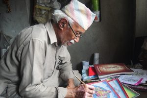 भक्तपुर नगरपालिका–६ का ८२ वर्षीय रामकृष्ण चित्रकार बासुकी नाग देवताको स्केजमा रङ्ग लगाउँदै । नागपञ्चमीमा बासुकी नागको फोटो घरको मूल द्वारमाथि टाँसेर नागपञ्चमी मनाइन्छ । तस्बिरःलक्ष्मी गारु/रासस Read more »